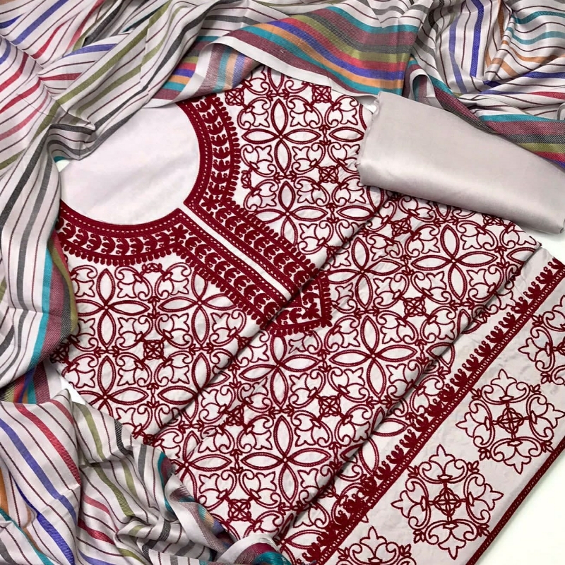 Marina Fabric Ari work with shawl Dupata 3pc suit | Dukan.pk